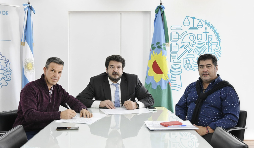 El intendente Maximiliano Sciaini y el ministro de Justicia y Derechos Humanos bonaerense, Juan Martín Mena, durante la firma del convenio que permitirá realizar trámites de Personas Jurídicas en el municipio.
