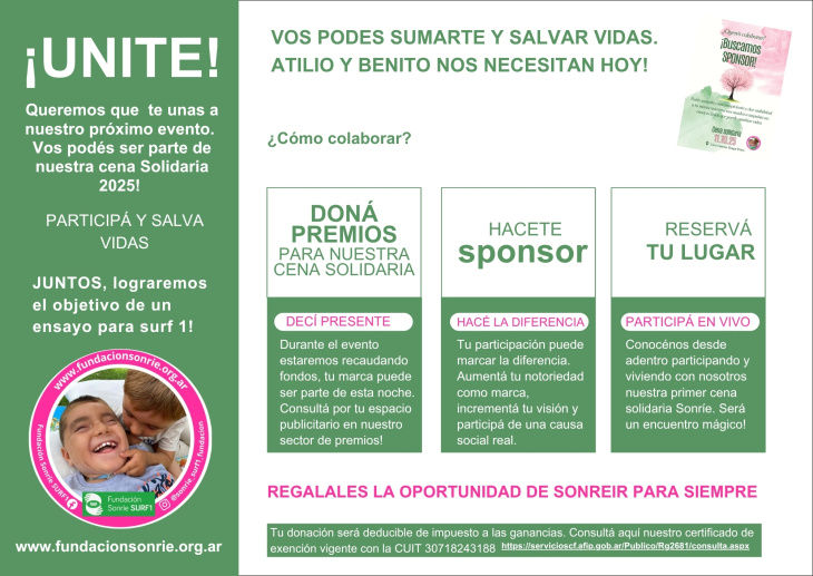 La Fundación Sonríe SURF1 anunció la realización de su Cena Solidaria 2025, un encuentro solidario que busca recaudar 50.000 dólares para continuar con un importante ensayo clínico de terapia génica destinado a tratar la mutación SURF1, una de las más frecuentes dentro del Síndrome de Leigh. La cita será este sábado 11 de octubre, y la fundación invita a toda la comunidad a sumarse y apoyar esta causa.