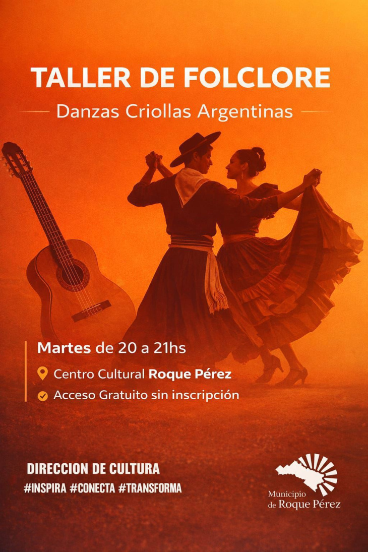 Por otra parte, continúa el Taller de Folclore – Danzas Criollas Argentinas, que se realiza los martes de 20 a 21 en el Centro Cultural Roque Pérez. La actividad es gratuita y abierta a toda la comunidad.