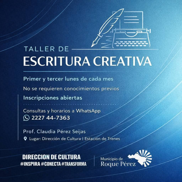 También se desarrolla el Taller de Escritura Creativa, a cargo de Claudia Pérez Seijas, orientado a quienes deseen iniciarse en la escritura o potenciar su creatividad. La propuesta se realiza el primer y tercer lunes de cada mes. Para consultas e inscripción, se encuentra disponible el WhatsApp 2227-44-7363.